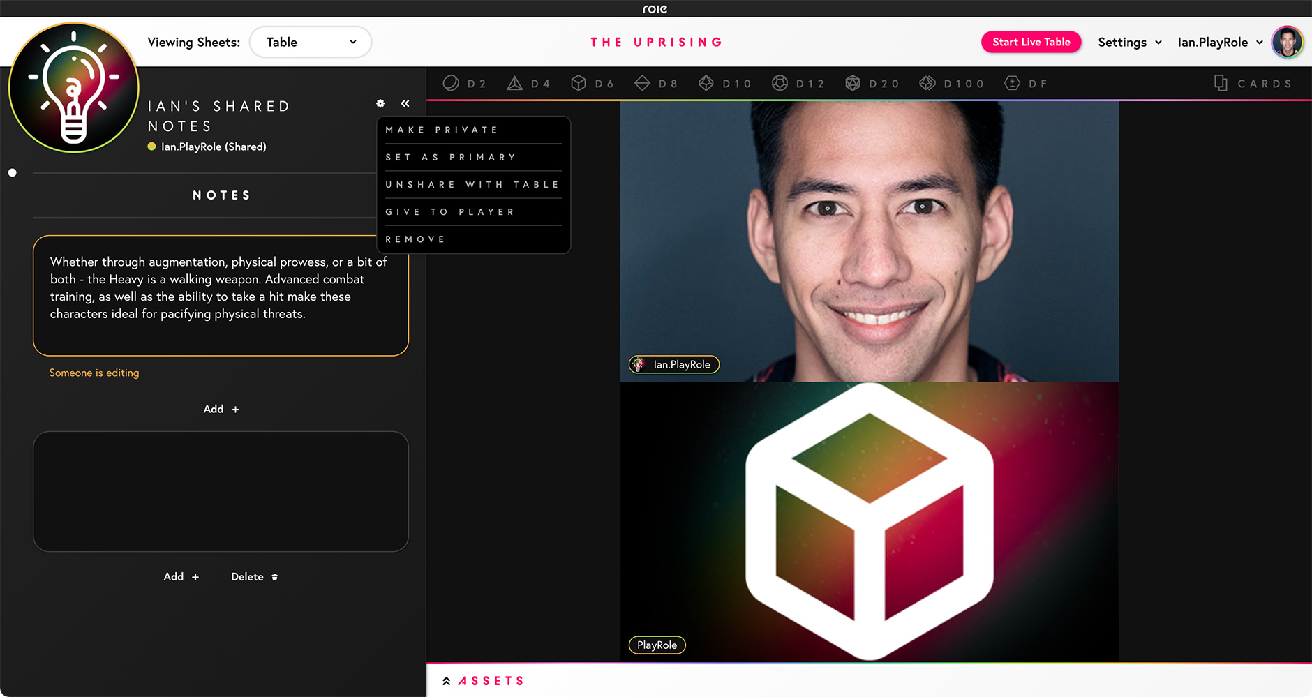 - Shared: The sheet is viewable and editable by everyone at the table (even if it is marked as Private).